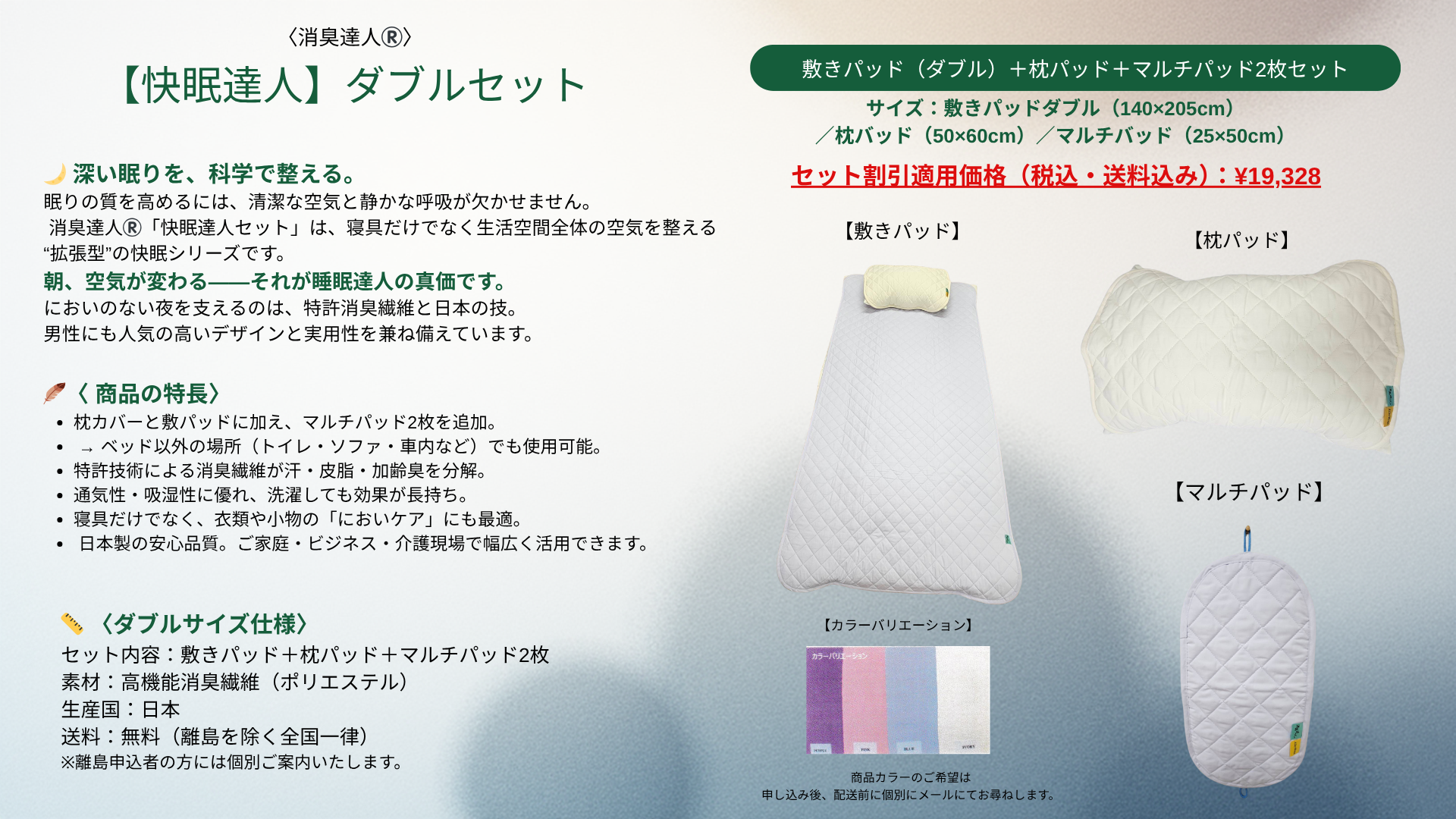 ALL ウエル・エイジング 日本の文化&伝統工芸 介護サービス お金 介護保険外サービス 相談 食品 終活 衛生用品 補助具 食べる力、口腔ケア 健康寿命延伸 介護施設長、管理者向け教育 士業サービス 介護経営者向け教育 認知症ケア 介護選び 介護職員向け教育 介護経営コンサル〈消臭達人®〉快眠達人 ダブルセット