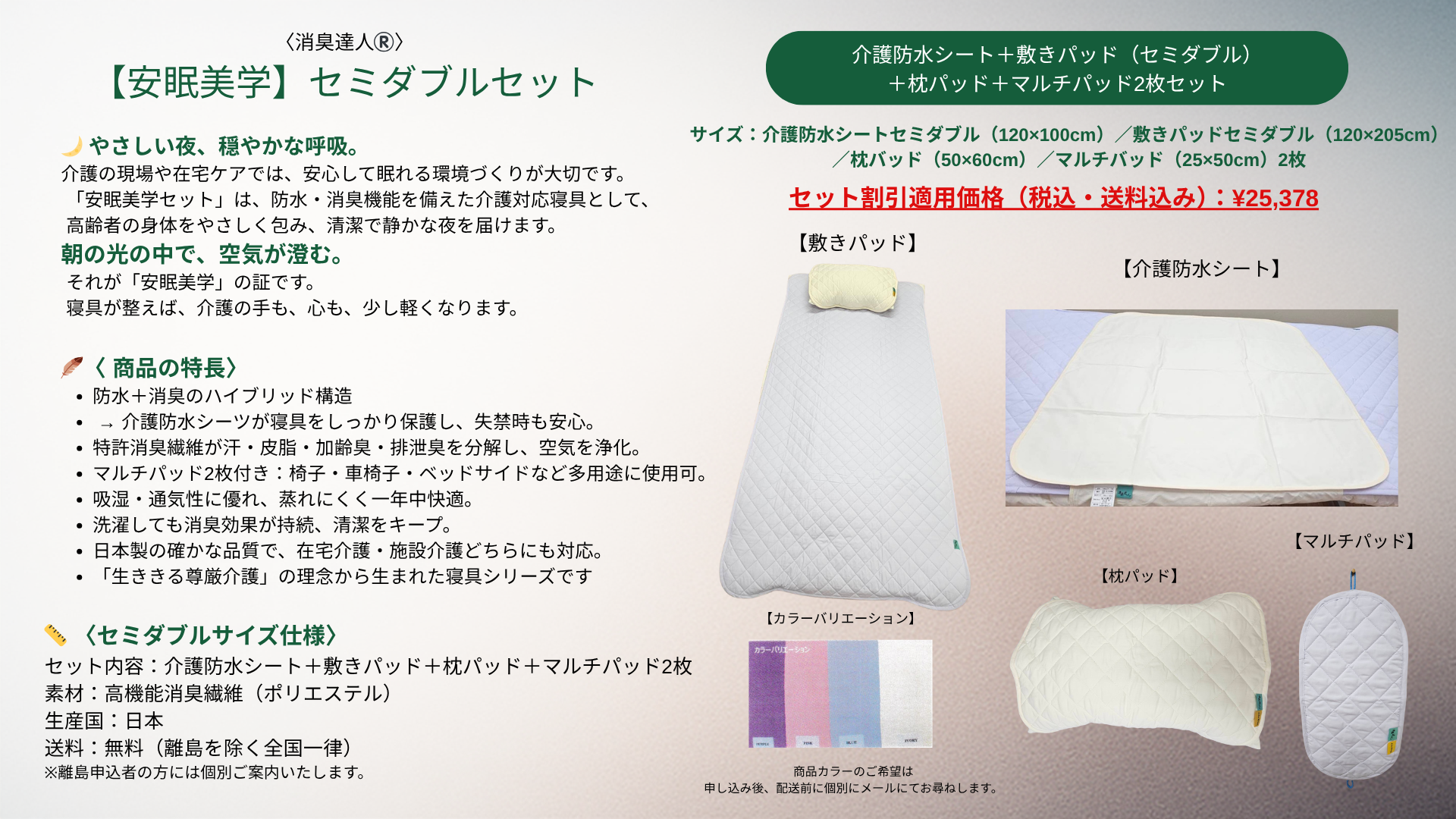 「安眠美学」セミダブルセットは、科学の安心と介護のやさしさを融合した快眠ケア寝具です。